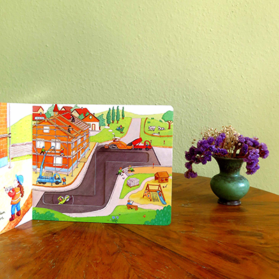 Fahr mit! Hier können schon die Kleinen spielerisch auf der Baustelle mithelfen! Große Schiebe-Elemente auf jeder Seite machen dieses Mitmach-Buch zum idealen Geschenk für Kinder ab 18 Monaten zum Immer-wieder-Spielen. Auf jeder Doppelseite lassen sich Bagger, Betonmischer & Co. mit dem Finger ganz einfach hin- und herbewegen. So erleben Kinder den Hausbau Schritt für Schritt vom Rohbau bis zum Umzug. Ganz nebenbei wird dabei die Feinmotorik gefördert.