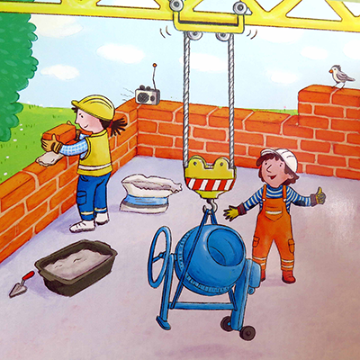 Im Apfelweg wird ein neues Haus gebaut. Der Bagger gräbt eine tiefe Grube, der Betonmischer bringt den Beton für das Fundament. Und mit dem Kran wird alles auf den Rohbau gehoben, was Kranführerin Nelly und ihre Freunde zum Bauen brauchen.