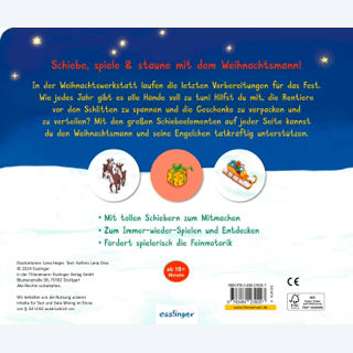 Weihnachten steht vor der Tür, und in der Weihnachtswerkstatt laufen die letzten Vorbereitungen. Wie jedes Jahr haben der Weihnachtsmann und seine Engelchen alle Hände voll zu tun! Nur gut, dass die Allerkleinsten sie mit dieser tollen Mitmachpappe tatkräftig unterstützen können. Mit den großen Schiebe-Elementen auf jeder Seite verstauen sie die Geschenke im Sack, spannen das Rentier vor, schieben den Schlitten durch den weihnachtlichen Wald und legen die Geschenke unter den geschmückten Baum.